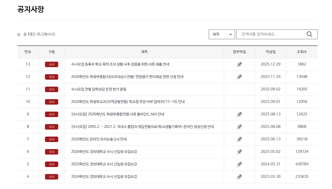 대한민국 대표 명문 사립대학 중 하나인 경희대학교의 입시 정보, 전형 안내, 전형 일정, 모집요강 등을 한 곳에서 확인하려면 공식 경희대학교 입학처 홈페이지를 방문하는 것이 가장 정확합니다. 수시·정시를 포함한 모든 입학 전형 정보를 가장 먼저 확인할 수 있는 공식 플랫폼입니다.