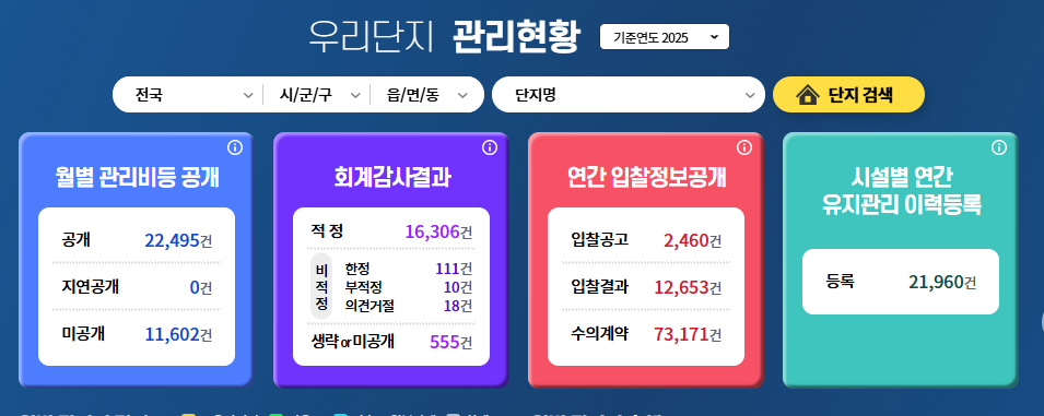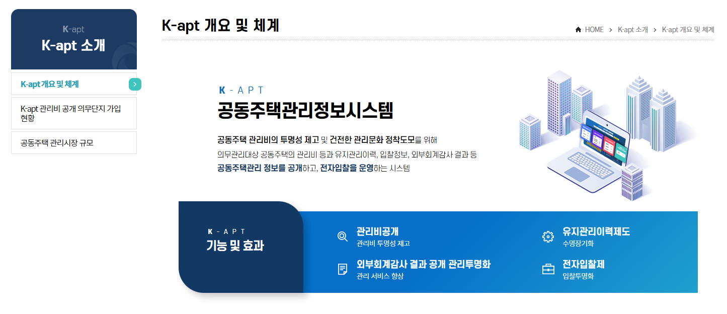 공동주택관리 정보시스템(K-apt)은 전국 아파트 단지의 관리비, 시설 점검, 입찰 정보 등을 투명하게 공개하는 국가 공식 플랫폼이다. 관리비 비교, 단지 정보 조회, 안전 점검 내역 확인 등 입주