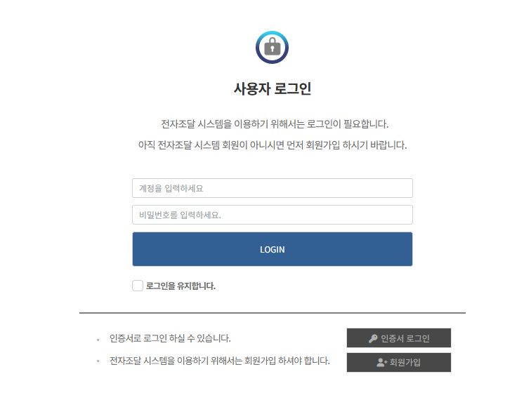 시스템은 기업등록 및 계정 발급이 필요하다. 처음 사용하는 업체는 회원 가입 및 인증 절차를 완료한 뒤 이용이 가능하며, 인증된 사용자만 입찰 참여 및 견적 제출 기능에 접근할 수 있다.