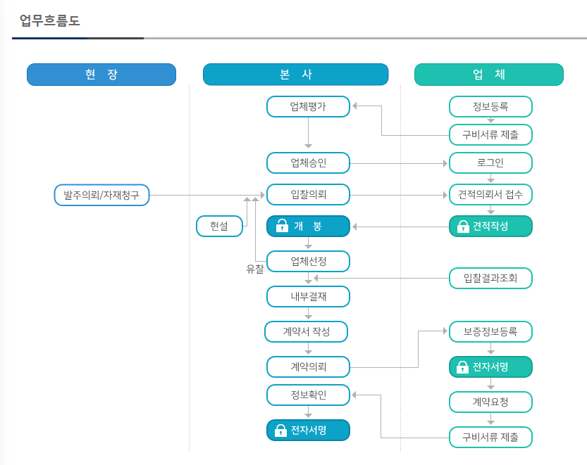 - 입찰 공고 확인, 견적 제출, 계약, 발주까지 온라인으로 한 번에 처리