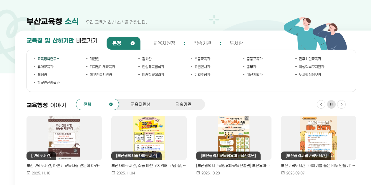 부산시교육청 홈페이지는 학생과 학부모가 필요한 교육 정보**를 자세히 안내합니다. 예를 들어 진로 상담·진학 자료, 학업 도움 자료, 교육 이슈 등이 정리되어 있어 학생 교육에 필요한 자료를 쉽게 찾을 수 있습니다. 또한 방과후학교 프로그램 정보도 확인할 수 있습니다.