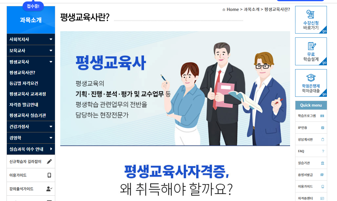 평생교육사, 사회복지사 자격증 과정은 학점은행제 학습과 연계되는 경우가 많아 자격증 취득과 학위 취득을 동시에 준비할 수 있는 큰 장점이 있다.
