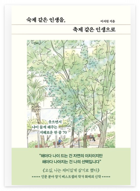 이서원 작가의 『숙제 같은 인생을, 축제 같은 인생으로』는 그런 시기의 독자들에게 필요한 명확한 지침서입니다. 30년 넘게 상담 전문가로 활동해온 저자는 인생 후반기를 살아가는 사람들에게 필요한 70개의 명문장을 통해, 새로운 시선과 태도를 제안합니다.