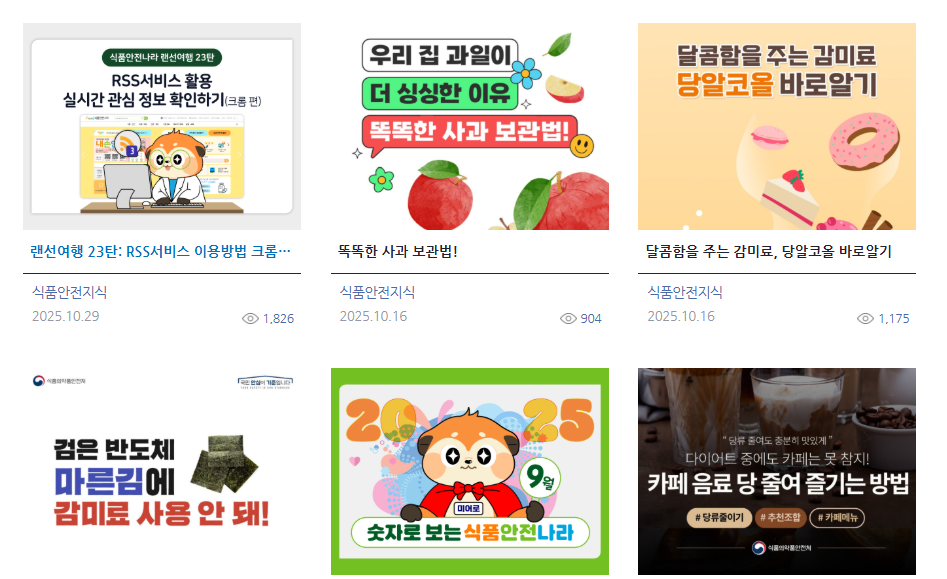 식품의 안정성, 이물 조사 결과, 부적합 사례, 위해 평가 자료 등 식품 안전 정보를 검색하고 확인할 수 있습니다. 소비자와 업계 종사자 모두에게 중요한 데이터입니다.