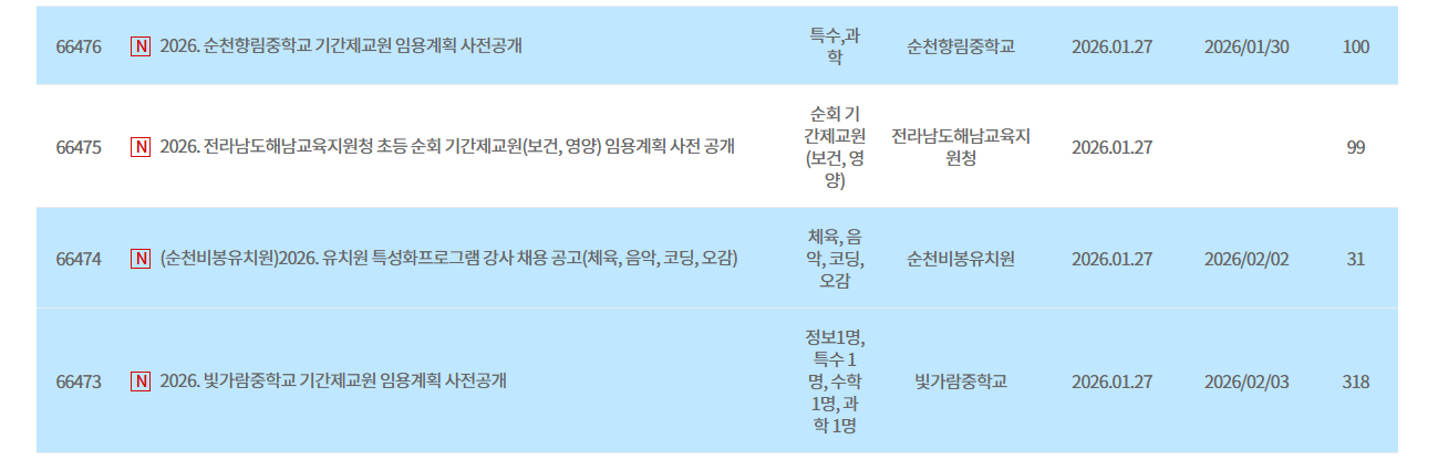 - 교과별 결원 대체를 위한 기간제 교사 채용공고 다수