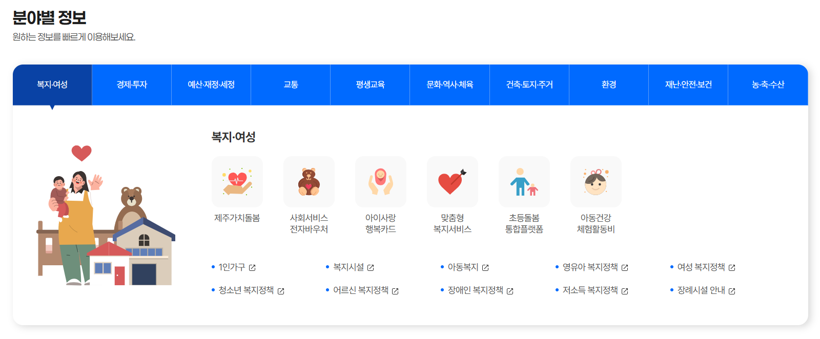 제주도청 홈페이지는 다양한 복지서비스 정보를 제공합니다. 아동수당, 기초연금, 장애인복지, 보건소 운동 프로그램, 영유아 교육 정보 등 주민 생활과 밀접한 복지·교육 안내를 빠르게 확인할 수 있습니다.
